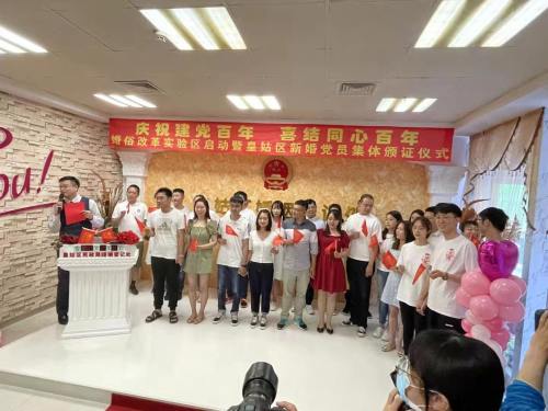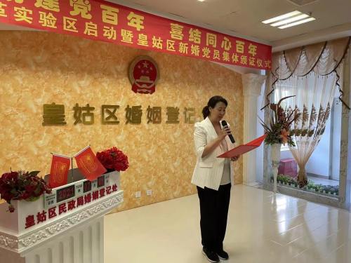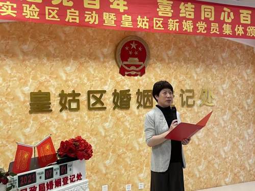 2021年7月1日上午,沈阳市皇姑区民政局在区婚姻登记处举办了“庆祝建党百年 喜结同心百年”婚俗改革实验区启动暨皇姑区新婚党员集体颁证仪式,10对新婚党员集体领证。