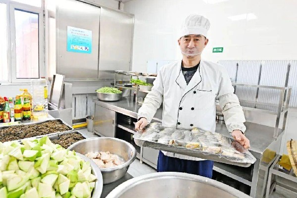 除夕的福利院食堂是最忙碌的地方,这里的烟火气藏着老人们最熟悉的年味。还不到10点,14位“大厨”就开始为当天的重头戏——年夜饭忙活起来。排骨炖芸豆、蒜蓉开背虾、酱猪蹄、红烧鱼、牛肉炖西红杮、葱烧蝉蛹……一道道“硬菜”被改刀切花、摆盘备好。200多人的年夜大餐可不是那么好做的,厨师们忙碌的场面很是壮观。“过年了,老人们讲究‘有头有尾’,一斤半一条的大黄花鱼不切段儿,每人一条,猪蹄也是一人一个。”厨师长张俭说:“忙活完这一餐,我们还要准备饺子,有芹菜馅、韭菜猪肉馅两种。”